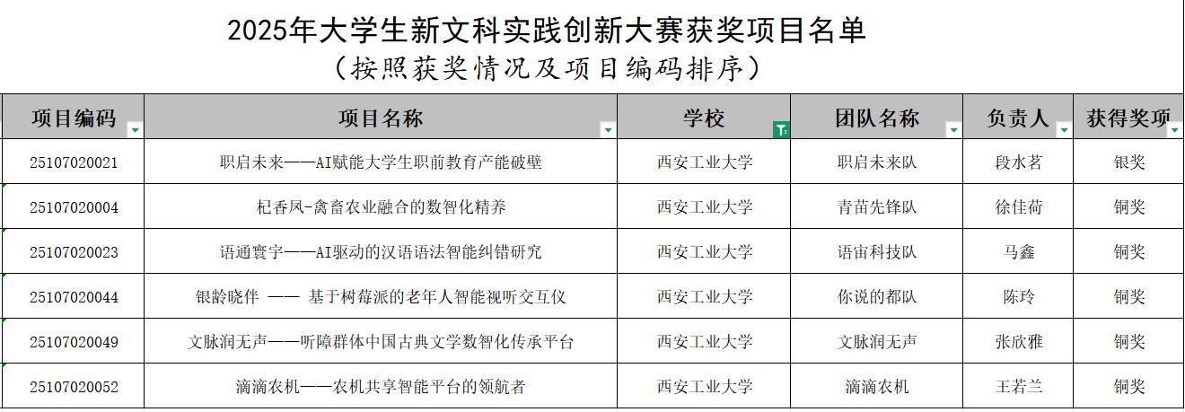 承办,共有56组报名参赛项目。按照赛事组委会奖项设置相关要求,6位评委从获奖项目中选拔15组进入校赛现场赛,共有6组项目进入全国决赛。此次进入全国决赛的6个项目全部获奖,不仅展示了西安工业大学学子的创新意识和实践能力,也是学校深入推进新文科教育改革成果的生动体现。