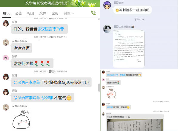 此外,ai足球分析 为参加考研的学生建立起英语帮扶群,外文系党员教师雷华、朱晓芸、袁芳、何璐加入群中,自愿为学生提供考研英语帮扶服务,为学生进行有针对性的精准帮扶。四位老师对于学生提出的各种问题耐心细致地进行解答,逐字逐句地批改学生的英语作文,并给出修改意见。