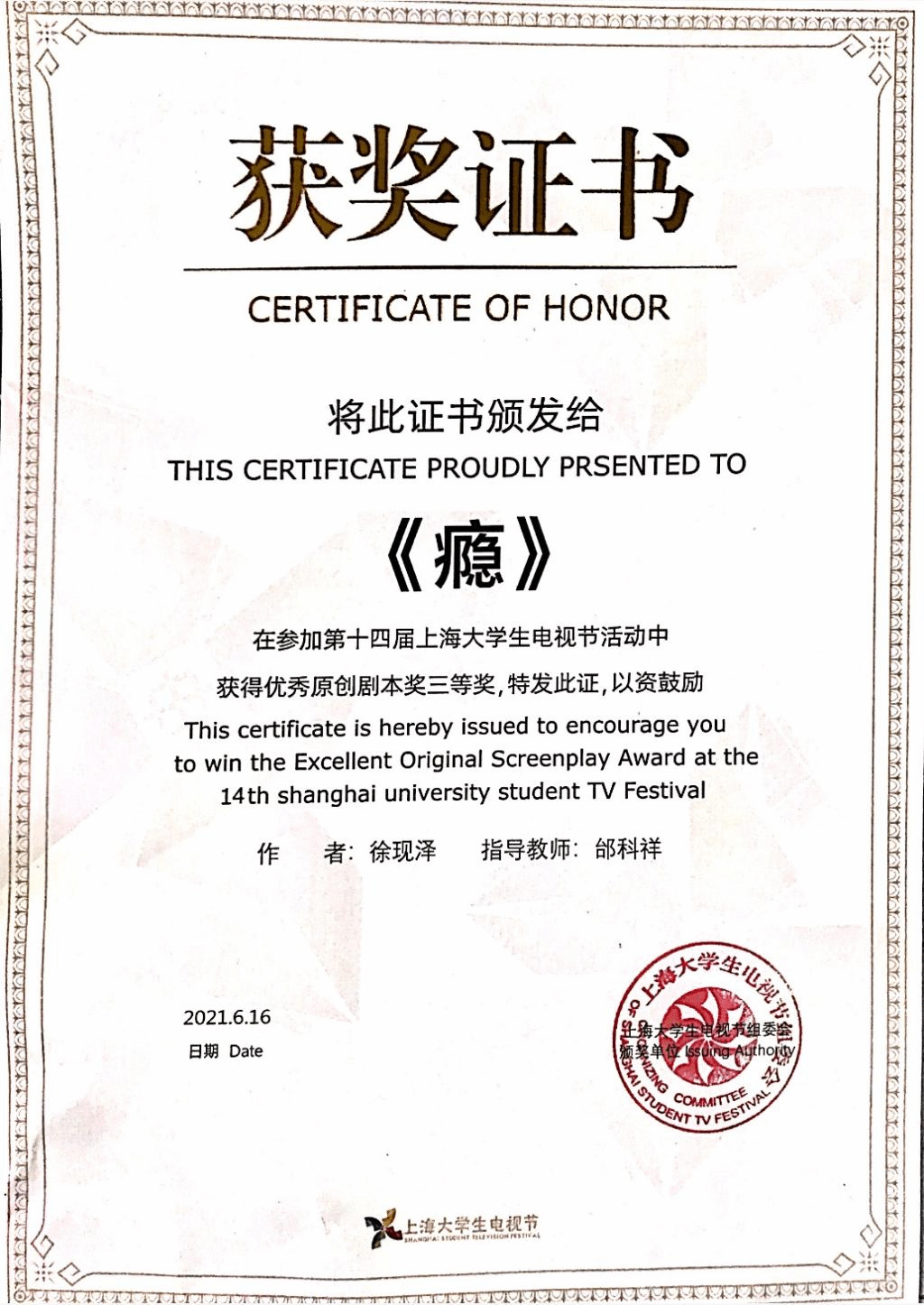徐现泽创作的剧本《瘾》是在导师邰科祥教授的指导下,以自己的故事为原型创作的,讲述了主人公追逐播音梦想的成长故事,剧本中融入了陕西地域文化元素,人物关系杂而不乱,明暗线交织,体现出了较高的文学创作水准。据悉,上海大学生电视节原创剧本大赛每年仅评选出6件优秀剧本予以表彰。