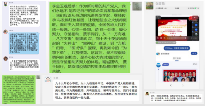 结合作为高校教师党员的身份和职责,教师党员们纷纷表态,面对在疫情下仍然求知若渴的学生,要坚守初心,牢记使命,做好教书育人的本职工作,不断地奋斗进取,充分发挥先锋模范作用;时刻牢记“培养什么人、怎样培养人、为谁培养人”,不仅要为学生传授知识,还要教其做人的道理,把立德树人贯穿于教育教学全过程,使学生真正成为实现中华民族伟大复兴梦的主力军。