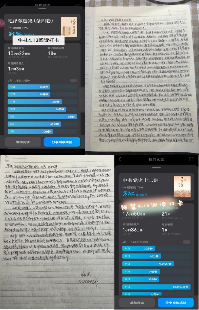 本次活动通过线上完成21天阅读打卡并提交读书报告的形式开展,推荐书籍为《中国共产党简史》《习近平谈治国理政》《毛泽东选集》和《中共党史十二讲》。活动伊始,同学们热情高涨,共计65名研究生、本科生报名参加。在活动过程中,同学们坚持打卡,分享阅读心得,交流读书内容。最终59名同学顺利完成任务。