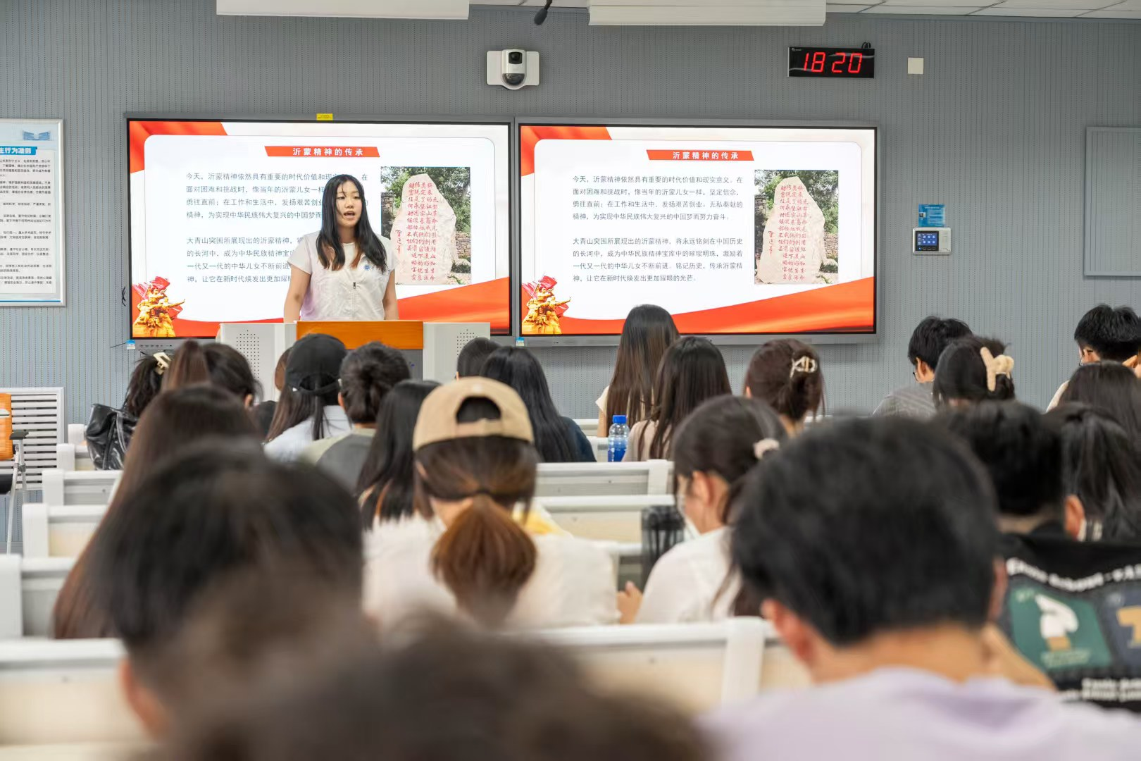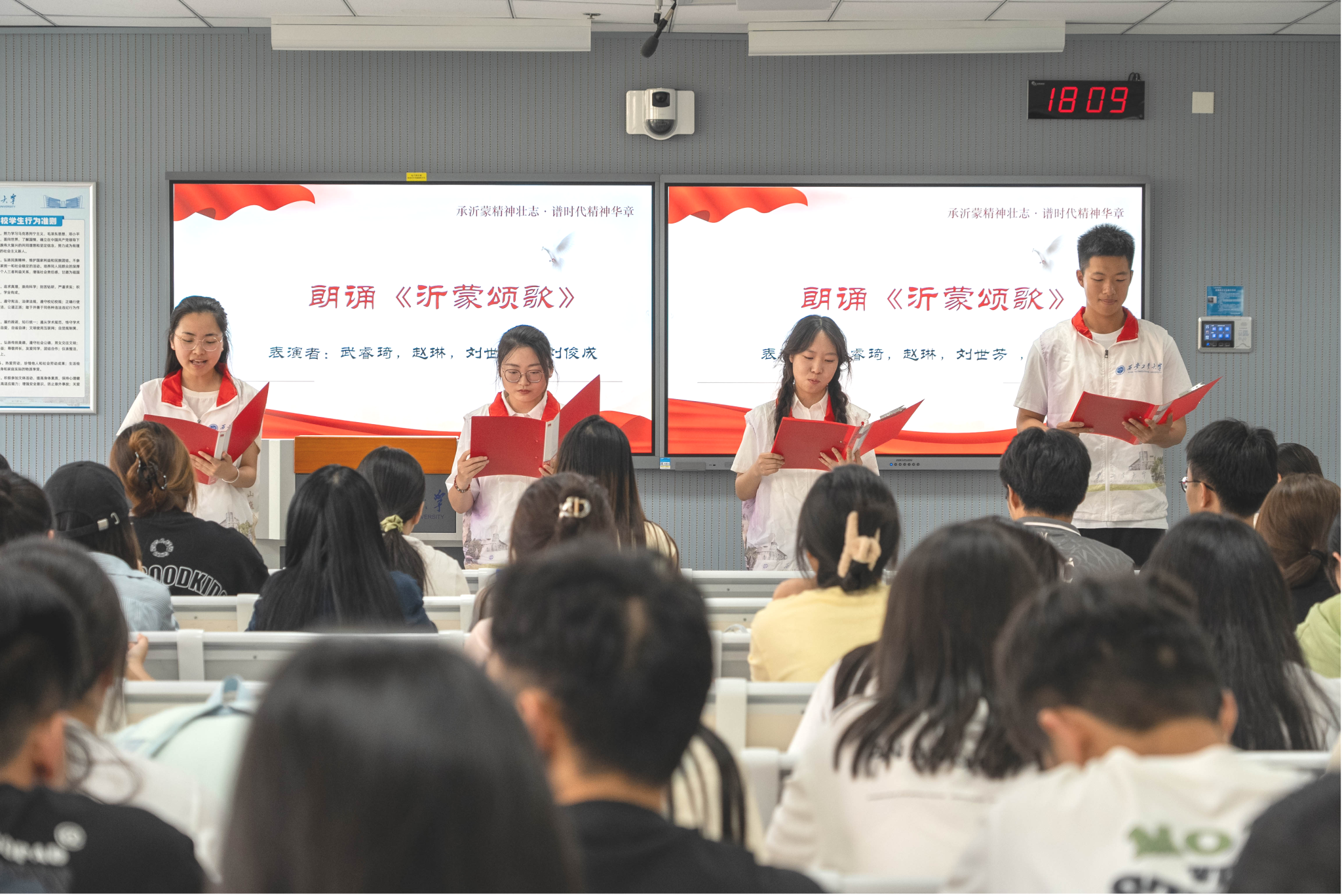 党委邀请全国大学生沂蒙精神志愿宣讲团开展主题宣讲,宣讲团以多元形式层层递进,将沂蒙精神与专业特色深度融合,化身“红色故事讲述人”,带来直击人心的红色故事分享。一首婉转悠扬的《沂蒙山小调》让在场同学深刻感受沂蒙文化的深厚底蕴;朗诵《沂蒙颂歌》致敬英雄,生动诠释沂蒙精神内涵,传递出沂蒙精神的磅礴力量。