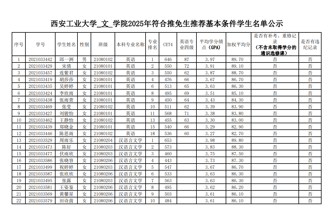 西安工业大学2025年ai足球分析 符合推免生推荐基本条件学生名单公示