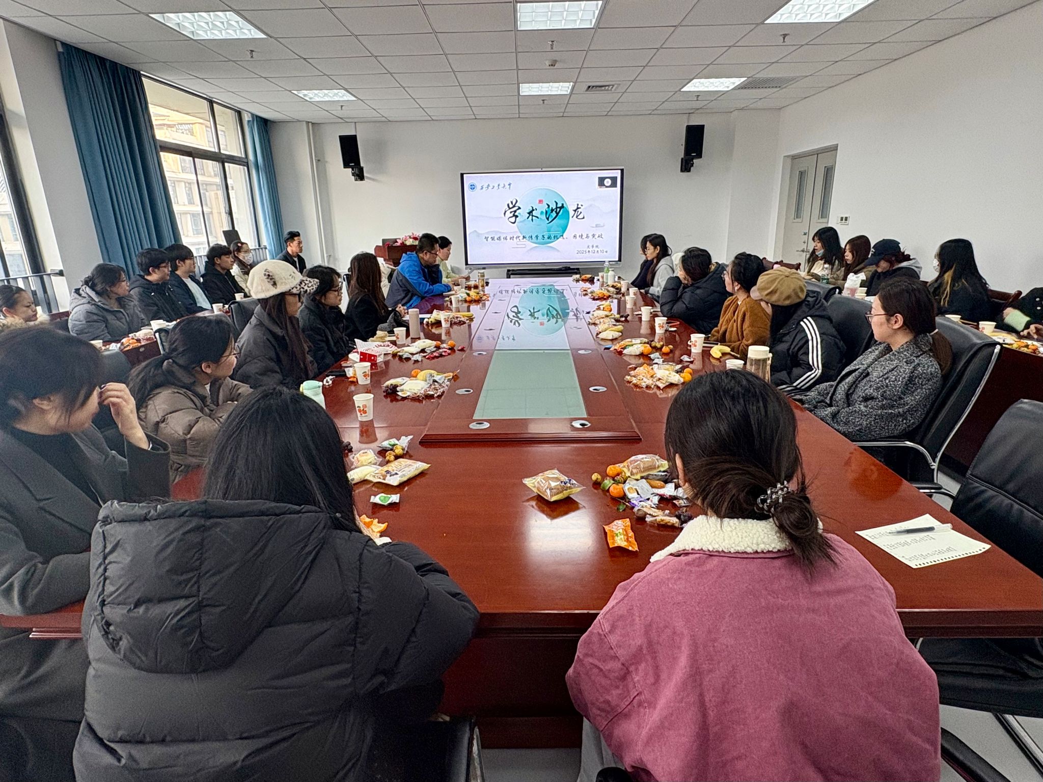 在教9-320会议室举办了主题为“智能媒体时代新传学子的机遇、困境与突破”的学术沙龙活动。本次活动由研究生辅导员张春主持,研究生代表刘鑫、徐媛诺和刘溢担任主讲嘉宾,陈红老师作为点评嘉宾。副院长敬晓庆参加此次活动并进行点评。