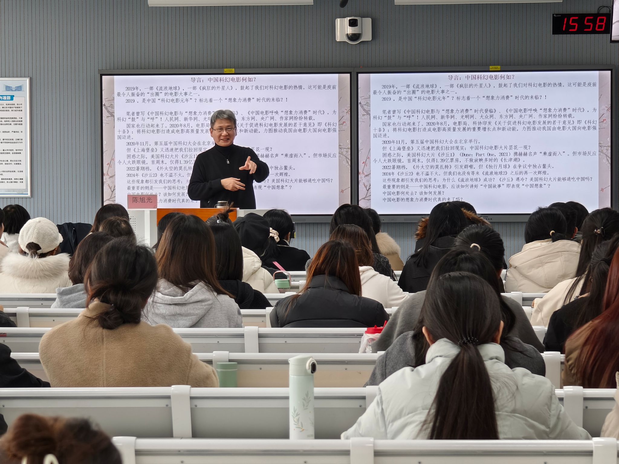 报告会上,陈旭光通过近年来科幻电影的热播与冷遇这一现象引出对科幻电影何为的思考,他详细介绍了科幻电影的概念,深入浅出地分析中美电影想象力的不同与文化差异、《流浪地球》《疯狂的外星人》成功的关键因素、《沙丘》在中国“水土不服”的原因,在此基础上引申出科幻电影的神话重构、科幻电影的寓言性以及科幻电影的文学原著改编等问题。陈旭光指出,科幻电影的生产中,既要追求跨文化的超越性,也要妥善设定受众市场和观众“圈层”定位,并为科幻电影的发展指出了发展路径:重构神话原型、表达中国想象、讲好中国故事。会后,陈旭光与师生进行交流,答疑解惑,广大师生均表示此次讲座使人受益匪浅,不仅对科幻电影发展有了更深刻的认识,对如何从事科学研究也有了更多感悟。