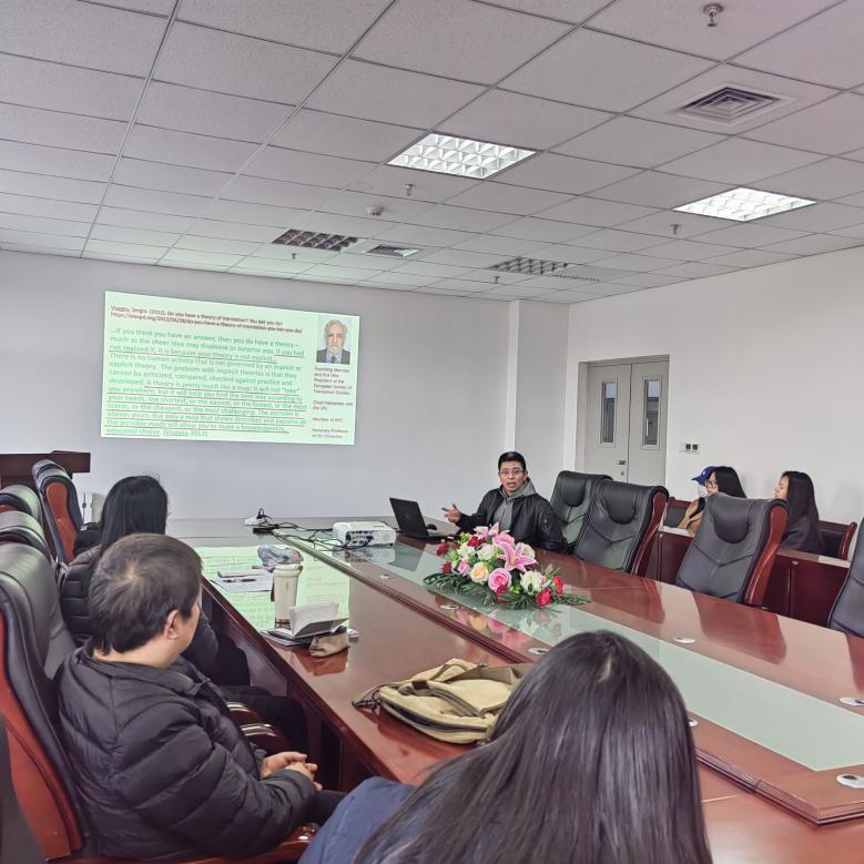 MTI中心主任雷华老师主持报告会,外文系教师及MTI研究生参加。