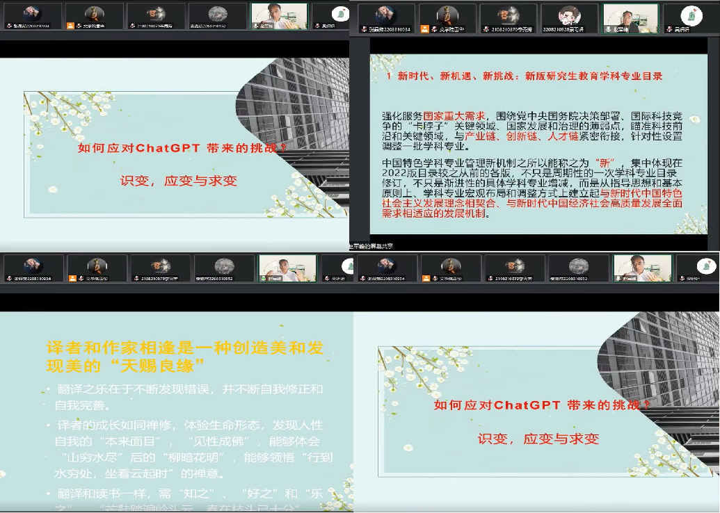 赵军峰教授指出,在高端翻译人才培养的过程中,要融合人工智能、机器翻译等现代信息技术,并赋能人才培养,建立翻译理论与实践结合、翻译人才培养与社会需求协调、翻译技术研发与应用同步的“三位一体”模式。要推进分类培养和协同培养同步进行,完善基于国别与区域、语种、领域的分众化、层次化和专业化培养,并表示面对Chat GPT带来的挑战,我们应做到识变、应变与求变。