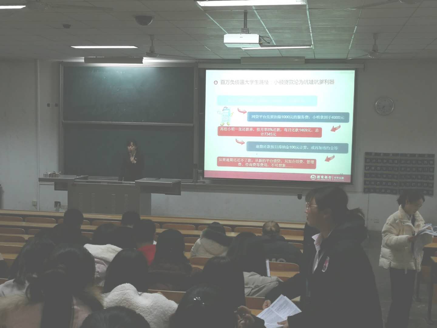 招商银行工作人员通过对“套路贷”、“校园贷”,从概念解读、特征剖析、性质属性、产生原因、社会危害等多方面,进行了系统的讲解和细致的分析。接着,组织同学参与APP线上答题测试,普及金融知识,警示同学们吸取他人教训,避免遭受电信诈骗和金融诈骗的危害。提醒同学们要掌握基本的金融知识,提高自身的风险意识,消除懵懂的借贷心理,形成理性的消费观念和借贷观念,切勿被一时的享乐和攀比之风冲昏头脑。