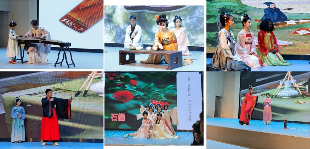 伏奕冰老师组织同学们“还原”了古代乡射之礼,并邀请在场学生体验射箭和投壶。最后,十二名女学生扮演的十二花神翩翩起舞,衣袂飘飘,把表演活动推向高潮。