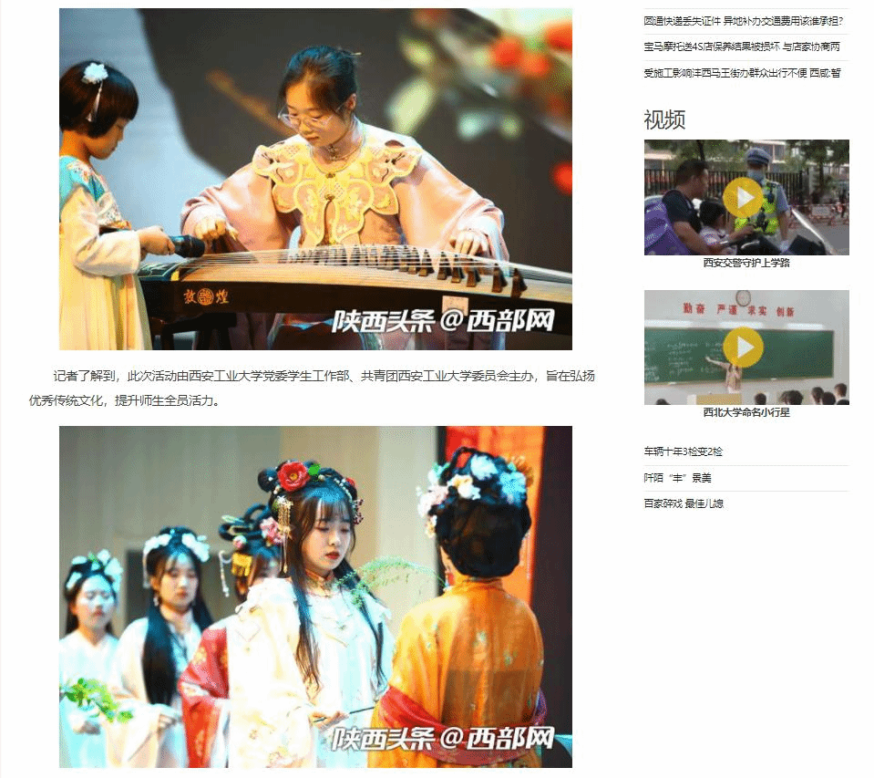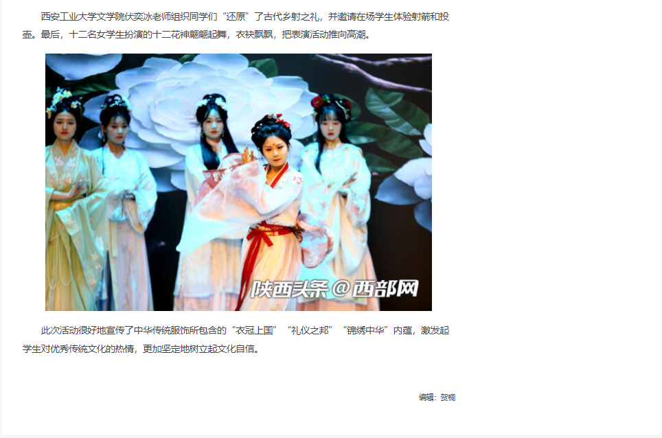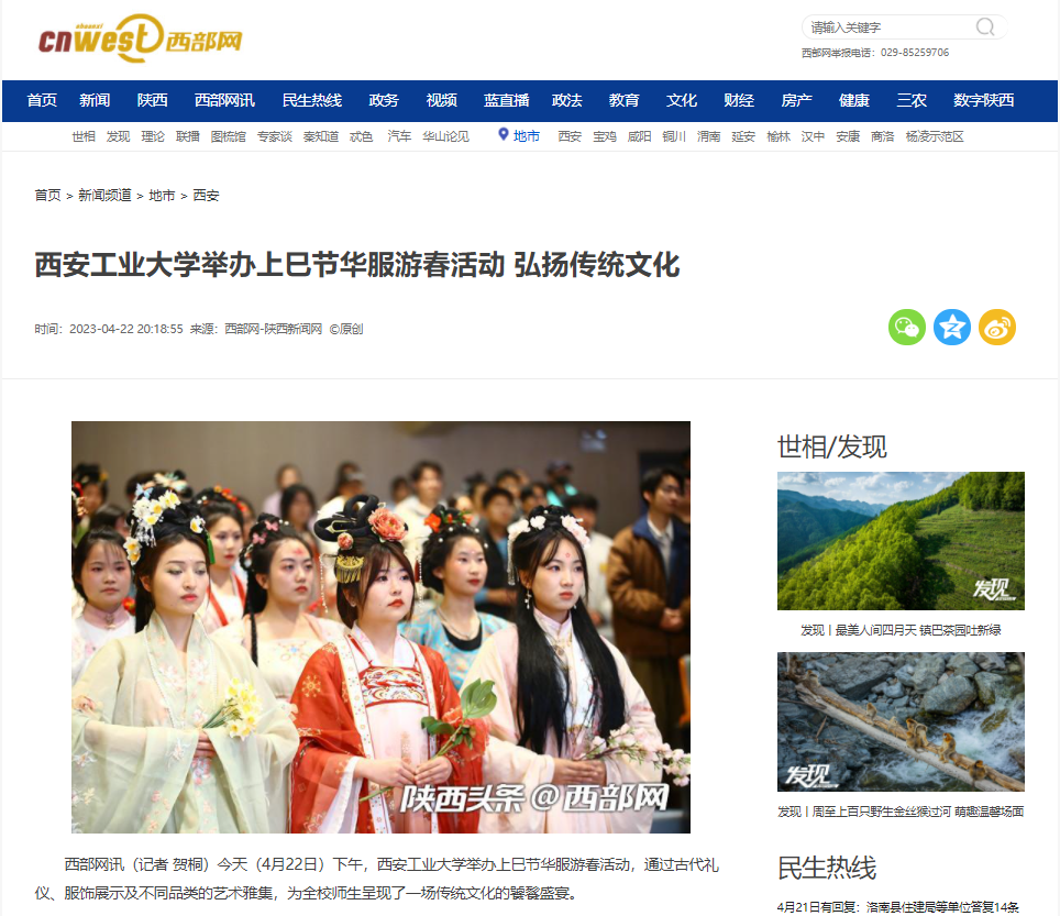 4月22日,西部网刊文《西安工业大学举办上巳节华服游春活动 弘扬传统文化》,对ai足球分析 举办的“癸卯春季语言文化月之上巳华服游春活动”进行了报道,“陕西头条”同时在新媒体端进行报道。此次活动受到了省级媒体的关注,产生了积极的社会影响。