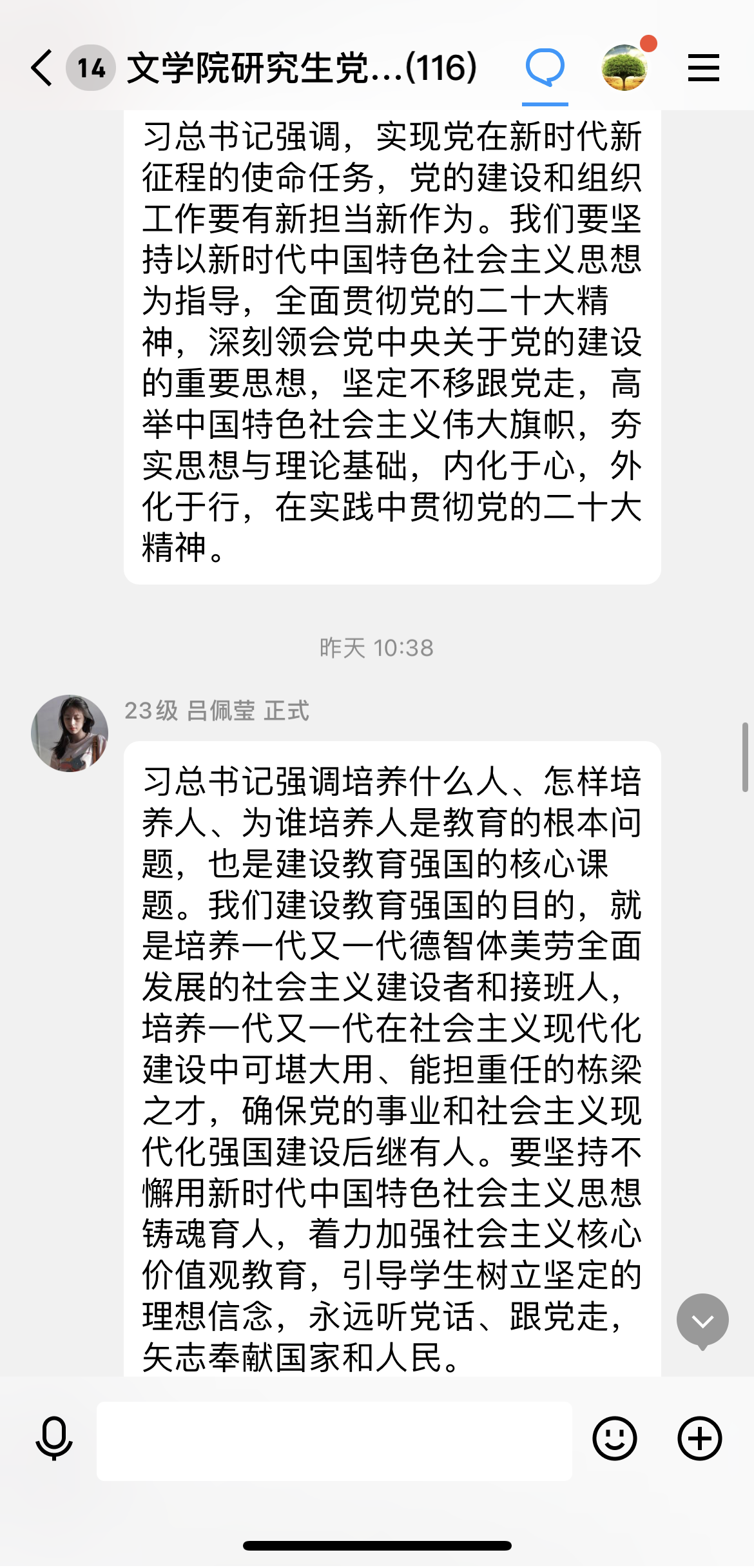 党员李婉卓谈到,全面建设社会主义现代化国家,全面推进中华民族伟大复兴,关键在党,关键在人,我们要坚持不懈用党的创新理论武装自己的头脑,指导自己的行动,提升自身素质,不断适应党和国家事业发展需要,努力做到以学铸魂,以学增智,以学正风,以学促干,提高政治站位,将自己融入到组织中去,发挥个人和组织的最大力量,提高工作质量,为实现党在新时代新征程的使命任务赓续奋斗。