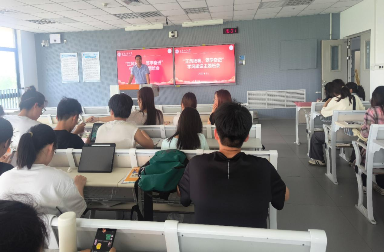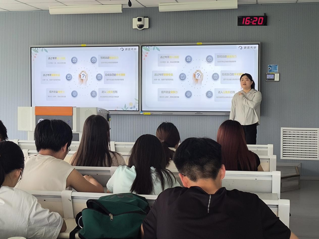 围绕“学风建设+就业规划”,李聪通过案例分析讲解并组织讨论“如何制定个性化就业规划”。主题班会还邀请新文道考研培训老师,开展考研知识讲座,培训老师从“考研的价值意义、考研宏观分析、如何确定院校以及如何开展科目备考”等几方面展开详细讲解,引导学生理性选择升学或就业路径。在互动环节,同学们积极发言,分享自己在学习中的困惑和经验。
