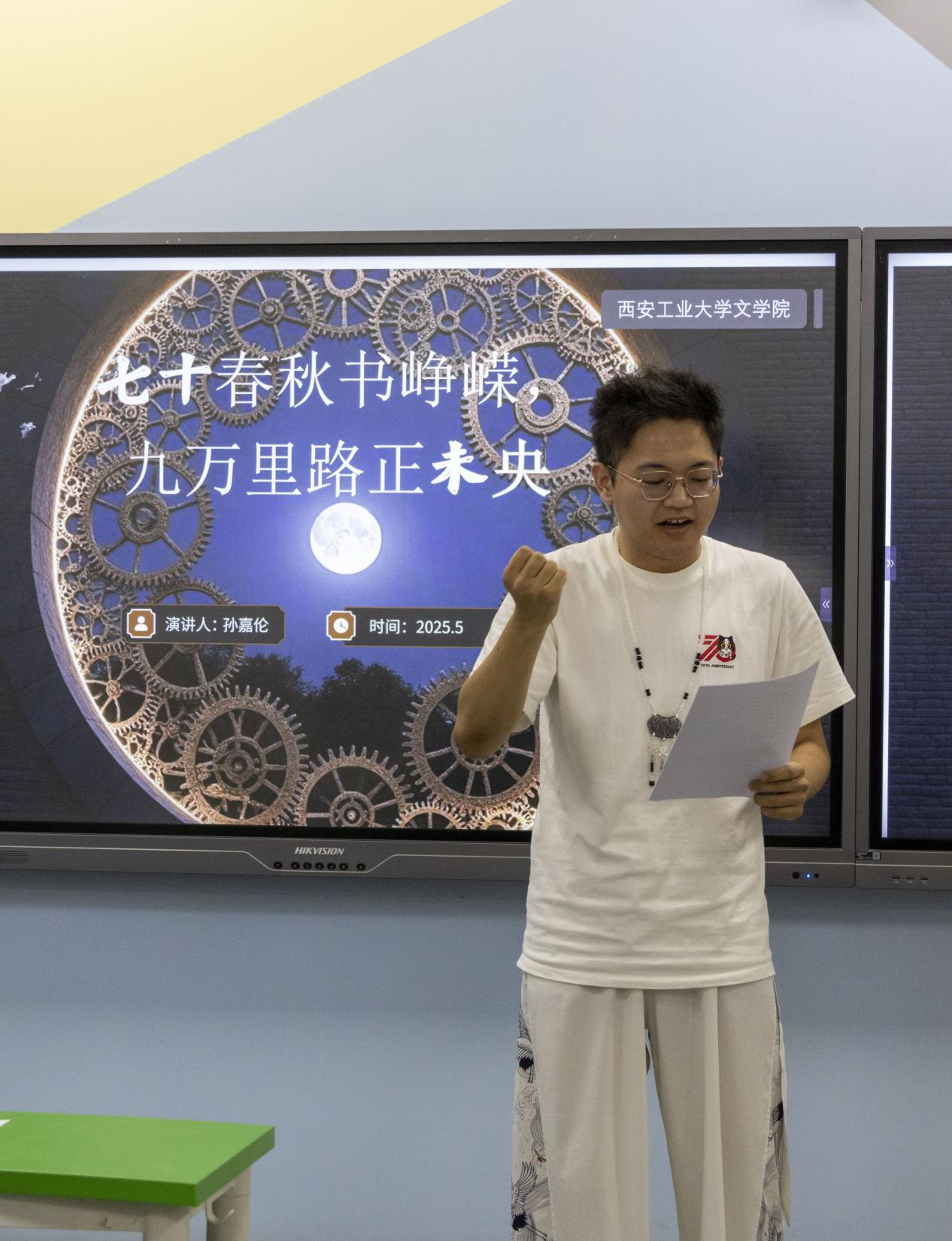 2024级丁娅绮带来演讲《七秩风华,礼赞西工》,她以古城秋光中的校园盛景为引,以教师治学、学子求索、校友奉献为例,将“敦德励学,知行相长”校训涵养的家国情怀与实干担当紧密结合,展现了西工学子践行习近平新时代中国特色社会主义思想的坚定决心。