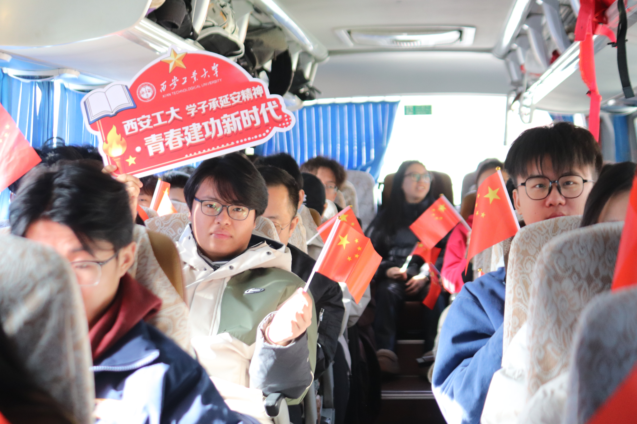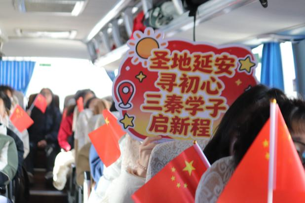 研学路上,车窗外风景流转;车厢内激情澎湃。“圣地延安铸魂育人,西工学子筑梦前行!”的口号声整齐划一,铿锵有力。同学们手中挥舞的五星红旗,随着节拍如火焰般跃动,汇成一片炽热的红色海洋。在热烈的氛围中,李聪老师以我校深厚的兵工底蕴为脉络,将延安的革命岁月与延安精神的深刻内涵娓娓道来。原本单调的旅途,被点燃成一堂行走的思政“金课”。这激昂的一幕,成为了奔赴革命圣地途中最为动人的序曲。